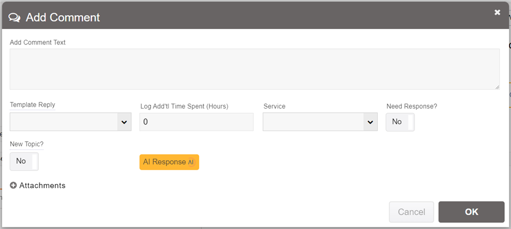 Another way to add a comment is to use the "Add Comment" button at the top right of the ticket.