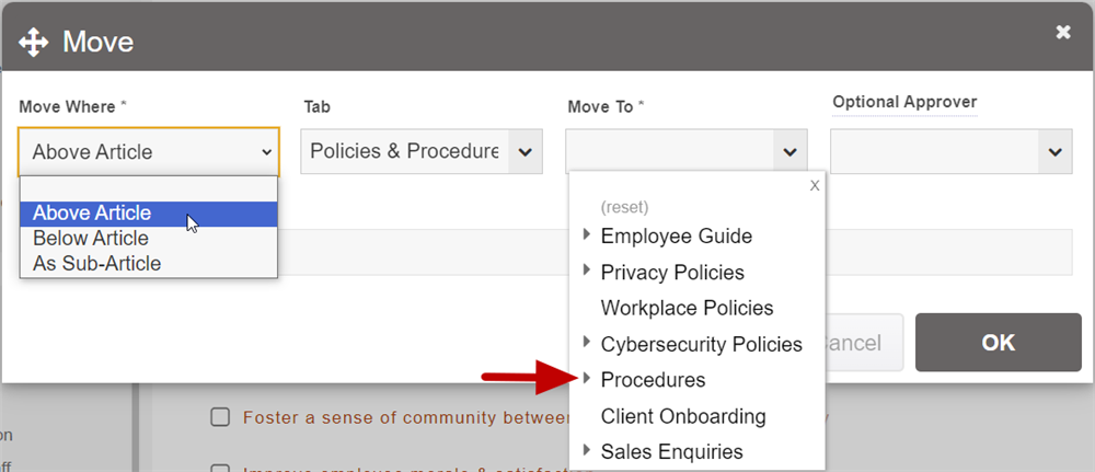 When moving an article, you specify the target location (including the tab, if you have multiple tabs) and a relative article (Move To*). You then specify the relation to the target article: whether the article will be moved as a sub-article of that page, or positioned above or below other articles on that page. You can move an article deeper into the hierarchy by clicking on the drill down button (triangular arrow) next to the targeted page.