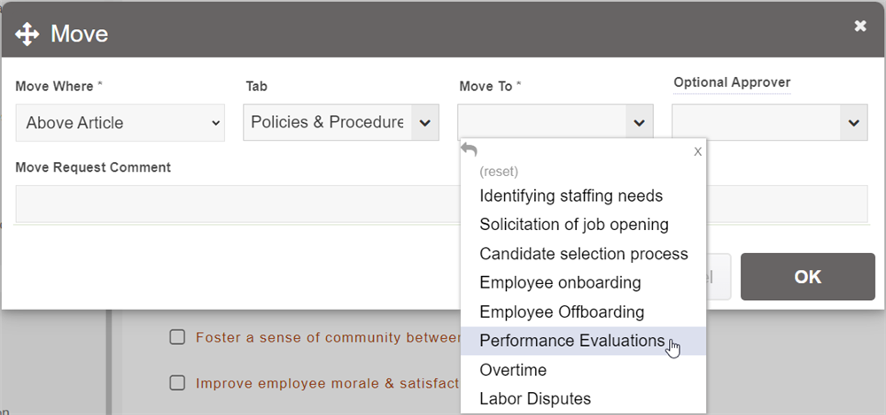 Setting an Optional Approver for the move action will send a one-time approval notification to the selected wiki manager user. This may be used to notify and seek approval from another subject matter expert user or supervisor for just that move change.
