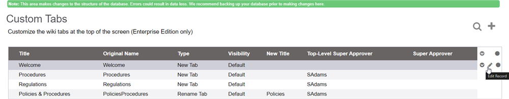 To set a Custom Tab Top-Level Super Approver, hover over one of the custom tabs in the list and click on the pencil icon to right of it to Edit Record.