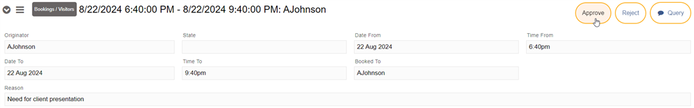 Once entered, it will not be activated until after the reservation has been approved. The approval request will be sent to the asset supervisor for that asset (of a parent asset, if none is specified at that level). They will then log in, review the reservation request and approve or reject the booking.