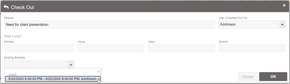 Once approved, the user will then check-out the asset using the same Check Out button, except they will select the booking details from the dropdown list at the bottom of the form.