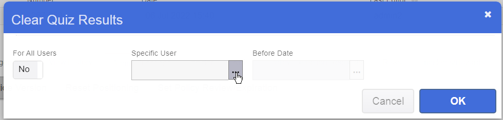 This pertains only to the quizzes on this specific article. You can select "For All Users", or select a specific user to clear the quiz results for. You can also specify a date, and it will then only clear out quiz results if the quiz was taken before that date. This can be useful if you update the article significantly and want users to take the quiz again. (Note, though, changing a quiz will invalidate any quiz results related to that quiz, so they will be forced to take it again anyway).