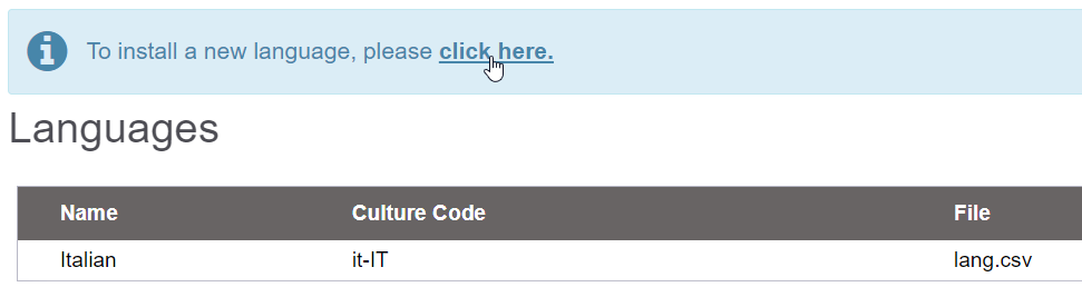 You will then see a list of languages that are installed (initially empty), and a link at the top to install a new language from our list of available languages.