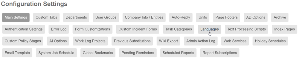 To add a language to the system, go to the Configuration tab as an administrator, then click on the Languages button.