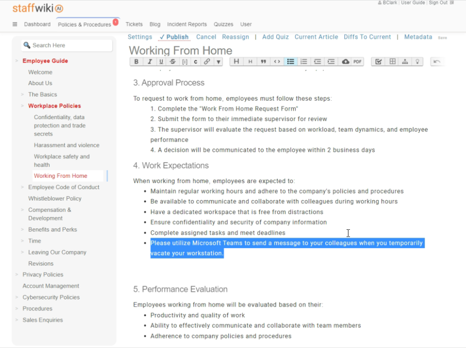 Upon reviewing the edited policy, the improvement is easy to see. Thanks to StaffWiki AI, policy writing has been elevated to a whole new level of enjoyment and efficiency. No longer will policy creation feel like a burdensome task; now it can be approached with a sense of excitement and fulfillment, knowing that the same level of quality is achievable without hours of work. With a click of a button, you can effortlessly publish your policy by selecting "Publish" and confirming.