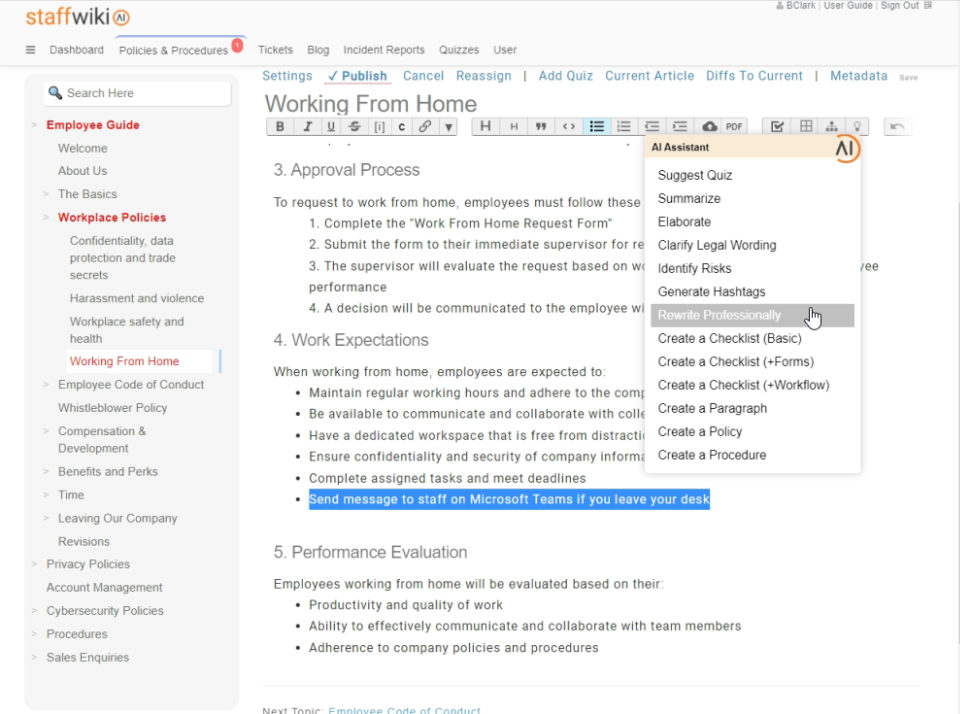 Let's say for instance that your boss emphasized the importance of staff notification via Microsoft Teams should they leave their desks. A minor adjustment is all you need - simply locate the appropriate section, insert a short statement such as "send message to staff on Microsoft Teams if you leave your desk", and proceed to the AI menu. Click on "Rewrite Professionally," and with a simple confirmation click, let the magic unfold as it generates a seamlessly integrated revision.