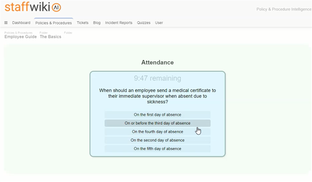 Once the user is satisfied with the revisions made to the quiz, StaffWiki provides an option to publish the changes with the click of a button. Post publication, a notification appears indicating the availability of the quiz. Employees can then engage with the quiz, verifying their understanding of the policy content. Nevertheless, the quiz may also serve as a wake-up call, revealing gaps in their understanding and prompting them to revisit the policy for better comprehension.