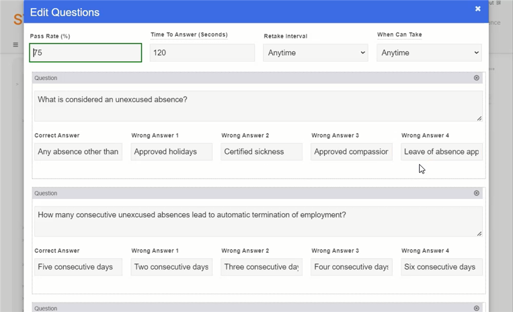 Once the AI has completed its task, it presents a set of quiz questions derived directly from the policy content. StaffWiki acknowledges that a user may want to fine-tune some of the items, so it provides an 'Edit Quiz' option, allowing users to revise or enhance the proposed questions as they deem fit. An eye-catching aspect of StaffWiki's AI feature is its ability to generate plausible wrong answer choices, a task that can often pose a challenge during quiz construction.