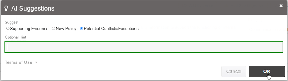 Alternatively you can use the AI engine (requires Enhanced AI to be enabled). You will do this by clicking the AI Suggestions action, but selecting Potential Conflicts/Exceptions: