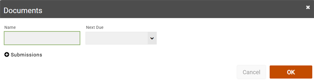 Here you can enter in a name for the type of document, eg, "General Liability Insurance", and specify when the document will be due next (put in today's date if it's due straight away). Underneath you can upload historic documents in the Submissions area, if you have any.