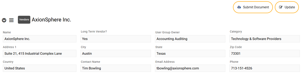 The main sub-tab is the Documents tab. This is where you will find all of the documents required for a vendor. This will be pre-populated based on the schedule you selected, each with a due-date set for today. It will also assign those to the specified user group, to remind them to submit that documentation.