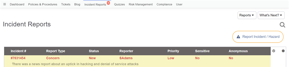 Additionally, a user can also report an incident directly from the Incidents Reports tab, by clicking the "Report Incident" button above the list.