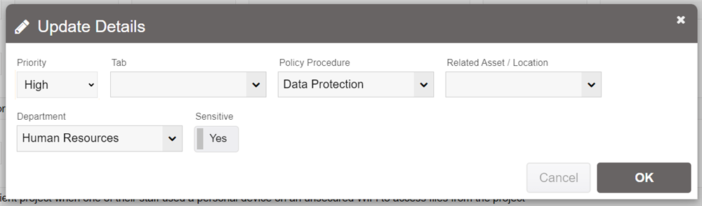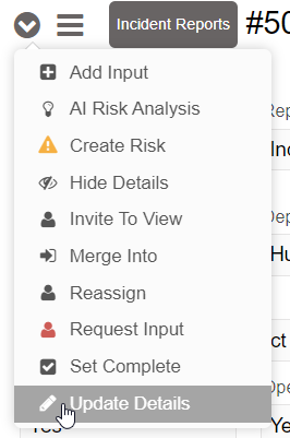 References to a policy, procedure, related asset/location, priority or department can be updated by going into an incident report's action menu and selecting "Update Policy/Dept".