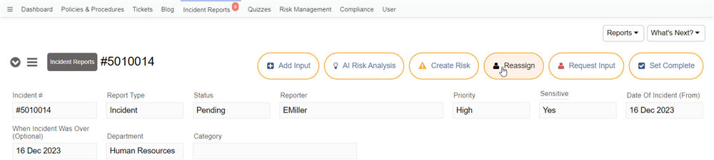 As the incident report is reviewed, situations may call for assigning additional users to review an incident report or reassigning responsibilities to another user. Updating references to a policy, procedure, asset, priority, or a specific department may also need to be done.