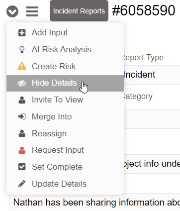To limit the visibility of an incident report's details and attachments, click on its action menu and click on "Hide Details".