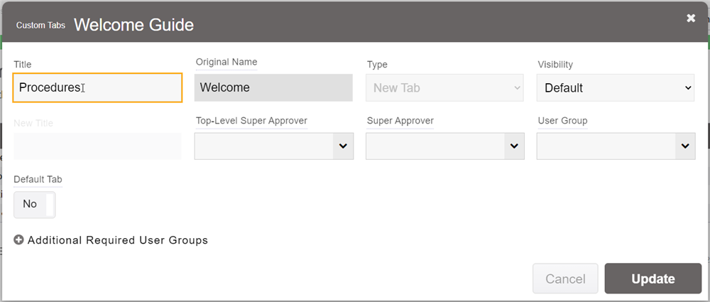 A Custom Tabs/Fields prompt will pop-up. In the Title field, input the name of the Default Tab you wish to change. Set Type to Rename Tab and enter the new name for the tab in the New Title field. The example used in the image below is changing the default tab Policies & Procedures to Policies.
