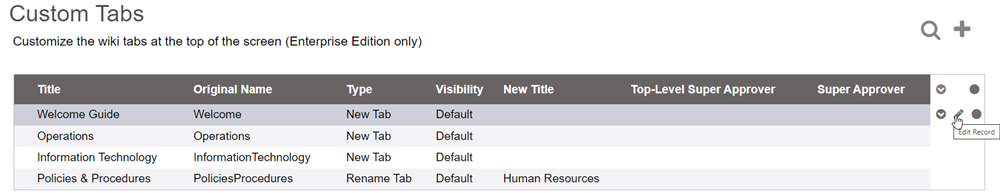 If you want to rename a Custom Tab, which is a tab you have already customized, hover over the tab in the list and click on the pencil icon on the right, to edit its record.