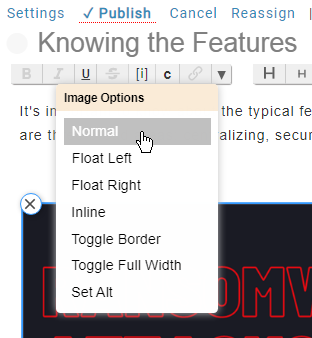 These will be detailed below. Once the image is inserted, you can click it and then click the format menu (down arrow) in the toolbar for additional options. There you can "float" the image to the right or left, so that text wraps around it. You can also set the "alt" text on the image. This alternative text is used for screen-readers, and can help the search engine in locating the page. There is also an option in there to toggle a border for the image, which can be useful if the image has a white background.