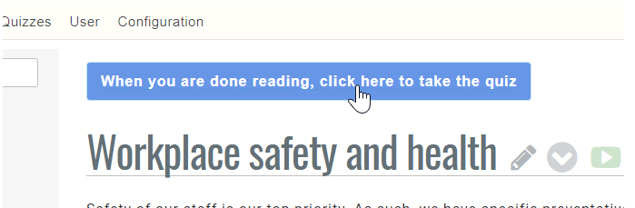 Users can also be requested to take quizzes as part of the attestation. If the quiz is marked as only being taken on request, then this will cause the quiz to appear for the user. They will then not be able to acknowledge the article until they complete (and pass) the quiz. The quiz will also include all quiz questions that haven't been passed in any sub-articles.