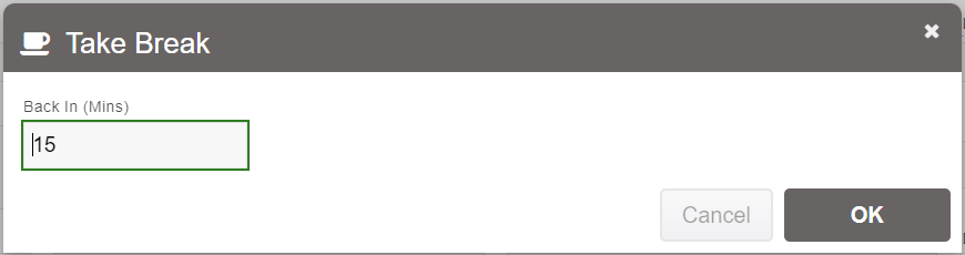 Similarly to breaks, users can signify if they are away for lunch by clicking the "Take Lunch" button. The form will default to 60 minutes but is editable. The amount of time entered is meant to display to user managers the length of time you intend to be away. Time taken for lunch is not included in the total time logged.