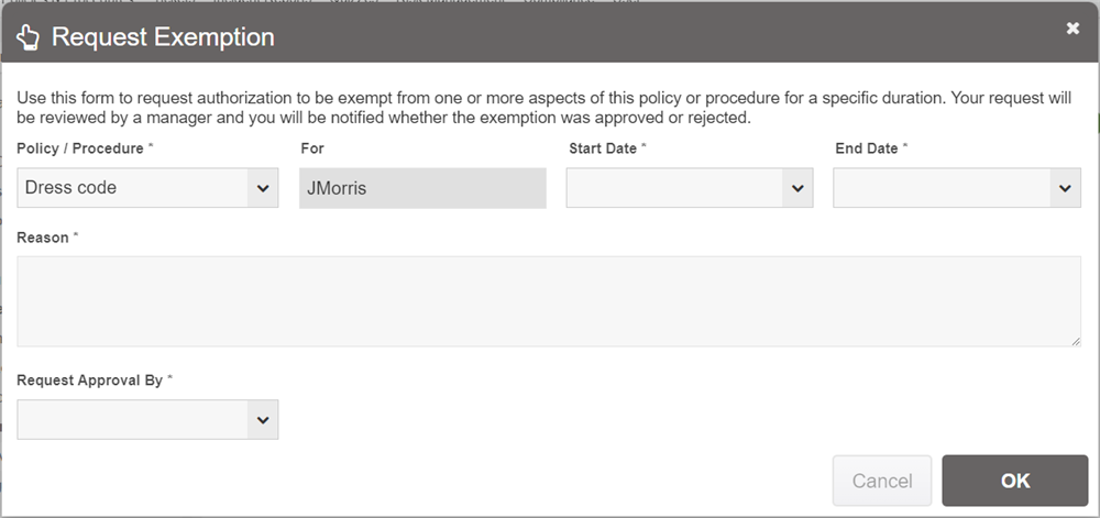 While policies are intended to be followed at all times, there will likely be times when exemptions are required for specific situations. To cater to this, our platform lets you request what is called a "Policy Exemption" authorization. This is a form you fill out, specifying the policy you want exemption from, the reason for the exemption and the date period you require it for. You will also specify the manager who will approve the request.