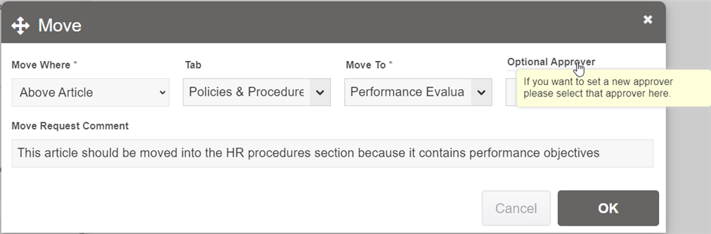 Setting an Optional Approver for the move action will send a one-time approval notification to the selected wiki manager user. This may be used to notify and seek approval from another subject matter expert user or supervisor for just that move change.