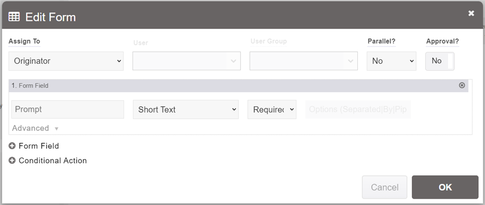 Skip: Unlike the conditions above, the Skip condition is run before the checklist entry it invoked. If the condition is true, then it will not assign that checklist entry to the user, instead it will be completed automatically and processing will continue to the next checklist entry. This can be used, for instance, to skip certain approval checklist entries if the amount entered is below, say, $5000.