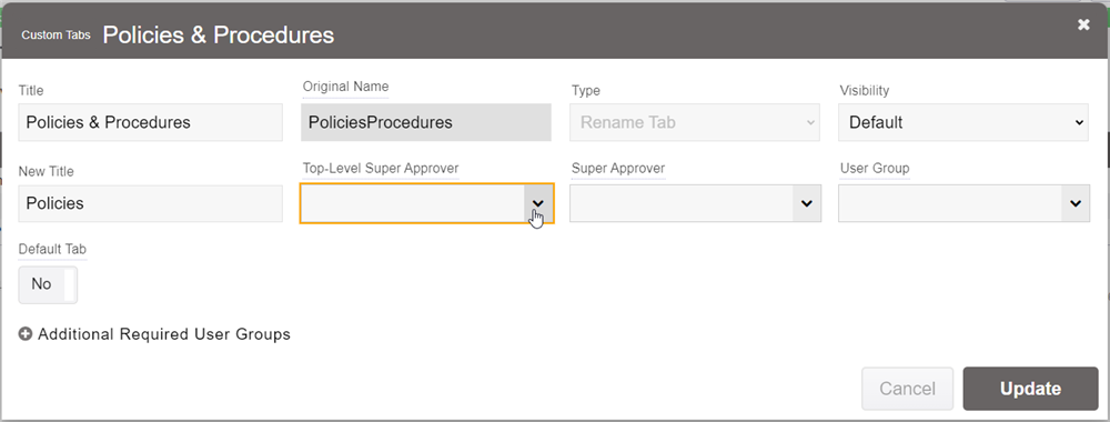 Note: These custom tab-specific top-level approvers will only be added to approval lists for top-level articles within that custom tab.