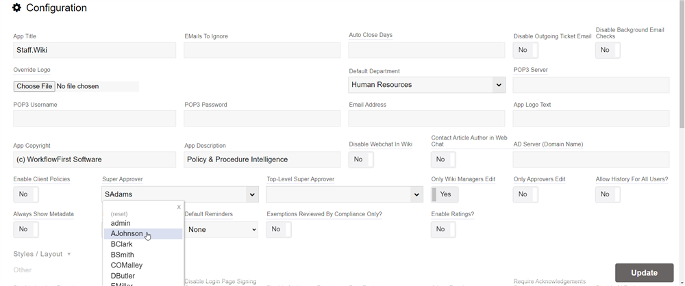 Within the same Main Settings of the Configuration tab, there is a field labeled Top-Level Super Approver whereby an approval user may be selected from.