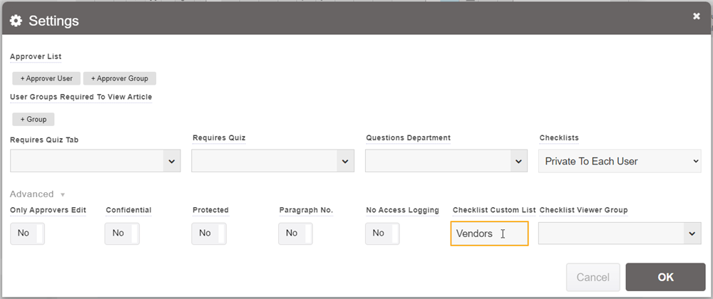 To hook up a checklist to a custom list, go to the article with the checklist. Edit the page and then go to Settings. In there you'll see an entry called "Checklist Custom List". In that field, put in the name of the list. For example, if the checklist is for submitting a new vendor, then the Checklist Custom List could be called "Vendors".
