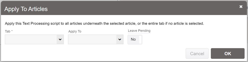 To actually apply this text processor to a specific article, click Apply to Articles.