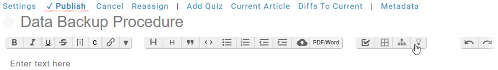 To access the AI function, first edit an article. Then, in the editor, click the lightbulb icon, highlighted below: