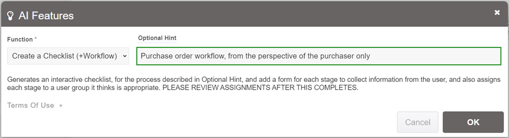 This AI function lets you describe the type of checklist you want to add, and it will automatically create the steps of the checklist for you. It can even add forms to the checklist items, and configure workflow to send each step to the appropriate department.