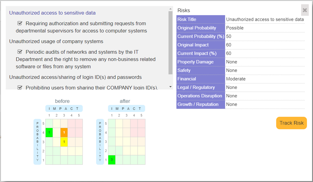 Below the risk and mitigation list be the risk matrix. Two of these are presented: the first showing the risks without any mitigation, and the second showing the risks with all mitigations applied. This can give you an idea of what mitigations may be missing.