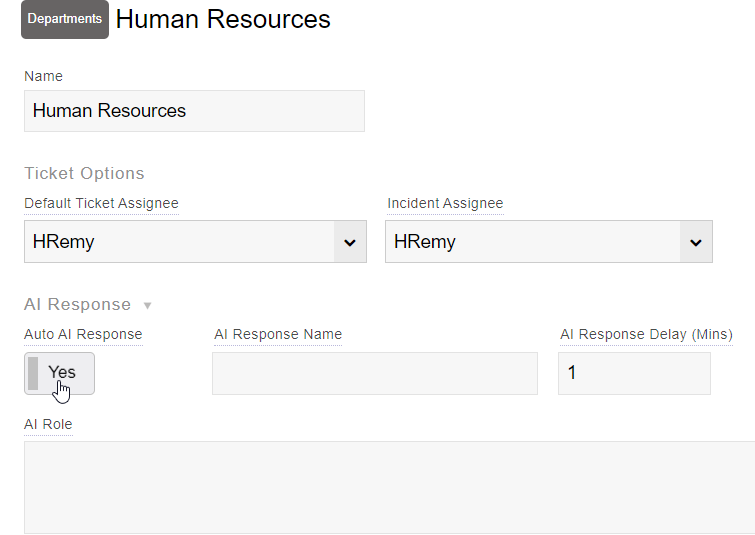 While above we explain how to manually have the AI response, you can also have the AI respond to tickets automatically. This requires some configuration which is defined on a per-department basis.