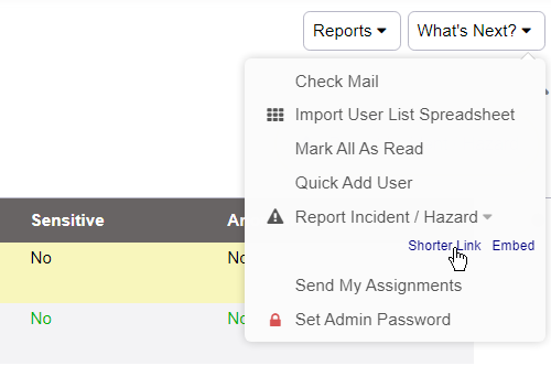 To create a QR code, first go to the Incident Reports tab. Then go to the What's Next button, click that, then look for "Report Incident" and click the down-arrow at the end to show the sub-menu. Then select "Shorter Link":