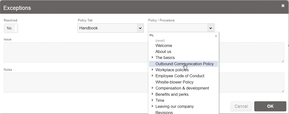 A compliance exception is a record of a failure in compliance. Currently our platform will record only a reference to a policy/procedure article in your system that conflicts with a specific compliance objective. You can find this under any objective, in the Exceptions tab. You can either click the "+" button to add an exception manually, in which case you will then fill in a form like this:
