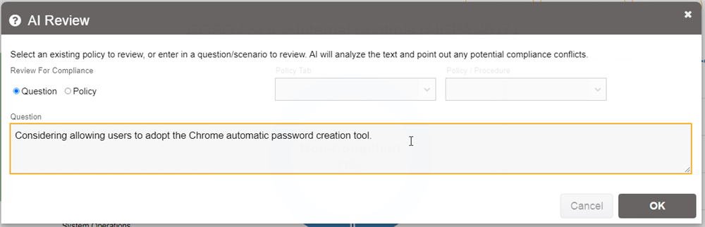 When on a compliance framework, if you have Enhanced AI enabled then you can submit scenarios for the AI to analyze from the perspective of the compliance framework to determine if the given scenario would comply or conflict with any of the objectives. You can also select an existing policy or procedure article for it to review.
