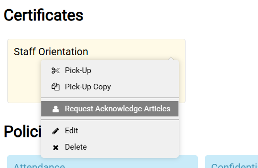 If you wish a number of staff to be sent attestations for all the articles in a certificate, you can use the time-saving action on a certificate called "Request Acknowledge Articles". This lets you select the list of staff that the requests will go to, and it will send a request for every article in that certificate. You can then monitor who has completed those attestations using the attestation reports on the dashboard.