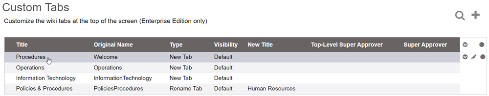 Both Default Tabs (also known as System Tabs), such as Policies & Procedures, and Custom Tabs can be renamed.