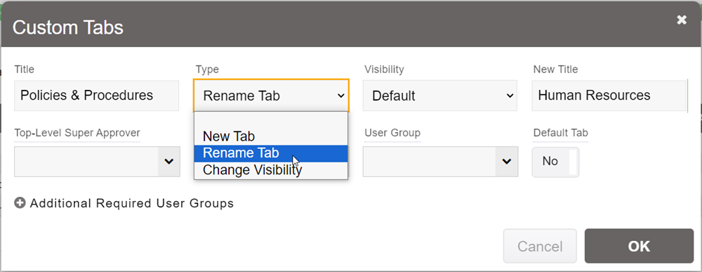 A Custom Tabs/Fields prompt will pop-up. In the Title field, input the name of the Default Tab you wish to change. Set Type to Rename Tab and enter the new name for the tab in the New Title field. The example used in the image below is changing the default tab Policies & Procedures to Policies.