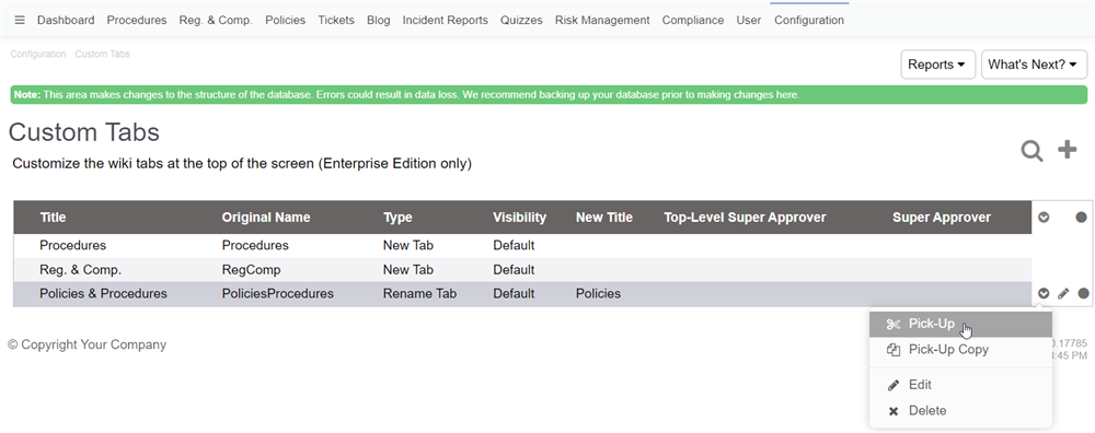 Click on either of the 3 options in the menu to proceed with the move. In the example shown above, the Internal Policies tab will be dropped in above the Testing tab.