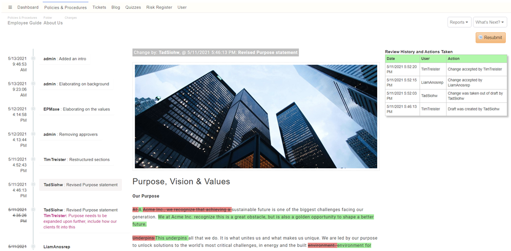 All versions, changes, and rejected change submissions can be reviewed in the History section of any article. These are tracked by the user who made the submissions and the date and time they were made.