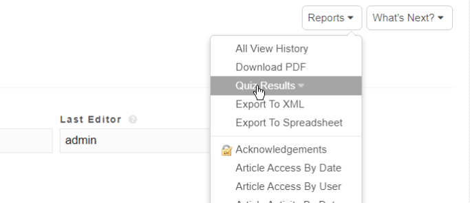 A Wiki Manager will be able to access quiz score results for any article. This will show the quiz results for all users who have taken the quiz, along with all the quizzes in child articles of that article.