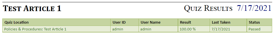 The resultant report will show each user who has taken the quiz, their result and whether they passed: