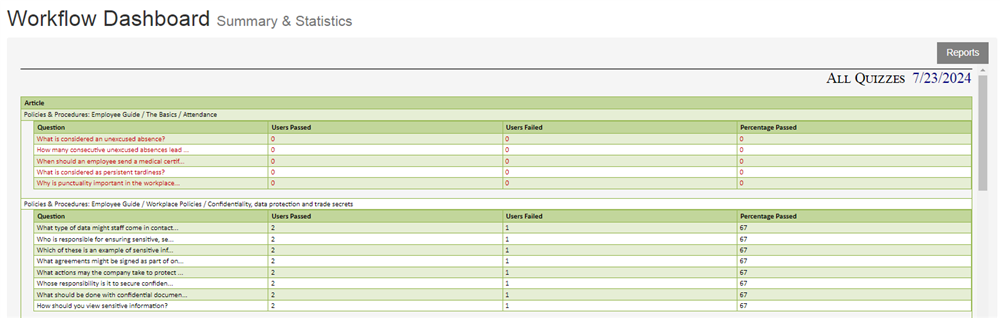 If you go to the Dashboard tab, click reports and then click All Quizzes, this will show you a list of all the quizzes in the system (that you have access to). It will show a breakdown of each quiz, showing the start of each question along with the number of people who have passed and failed, so you can keep tabs on the performance/difficulty of each quiz question. (It only shows the start of each question because the questions themselves are sensitive and should not be shared, as we wouldn't want to allow an easy way for people viewing the report to know the questions ahead of time).