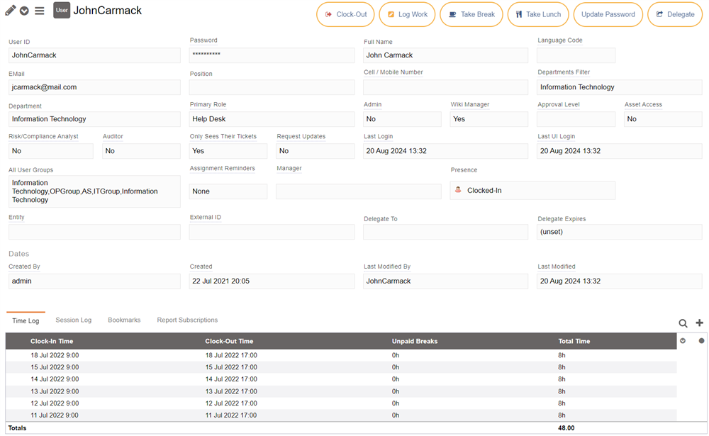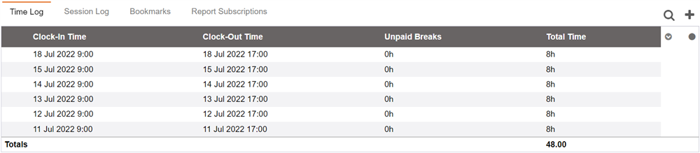 The information stored in the Time Log can be accessed underneath a user record, in the Time Log tab.