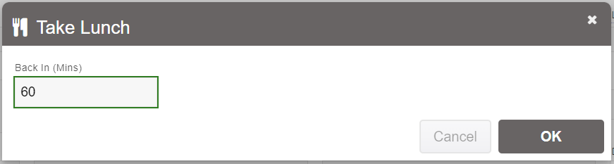 Similarly to breaks, users can signify if they are away for lunch by clicking the "Take Lunch" button. The form will default to 60 minutes but is editable. The amount of time entered is meant to display to user managers the length of time you intend to be away. Time taken for lunch is not included in the total time logged.