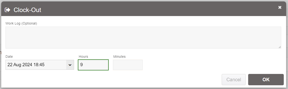 When a user has finished their day at work and is ready to leave, they will use the "Clock-Out" button to indicate they are no longer available. This will calculate the hours and minutes they were present (excluding breaks). You an also optionally specify a short description of any work accomplished that day, which will be recorded within the work log.